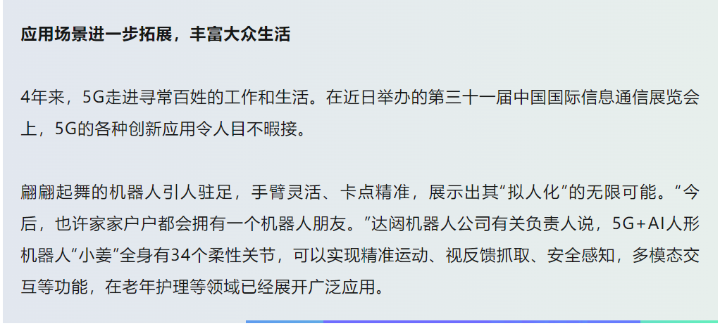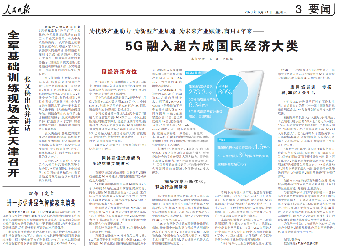 今天,《人民日報》在第三版要聞刊登《5G融入超六成國民經濟大類》,聚焦5G商用四年來我國5G產業生態建設的工作成果,報道特別關注達闥柔美人形智能服務機器人Cloud Ginger小姜作為5G創新應用,亮相第三十一屆中國國際信息通信展覽會,翩翩起舞引圍觀。