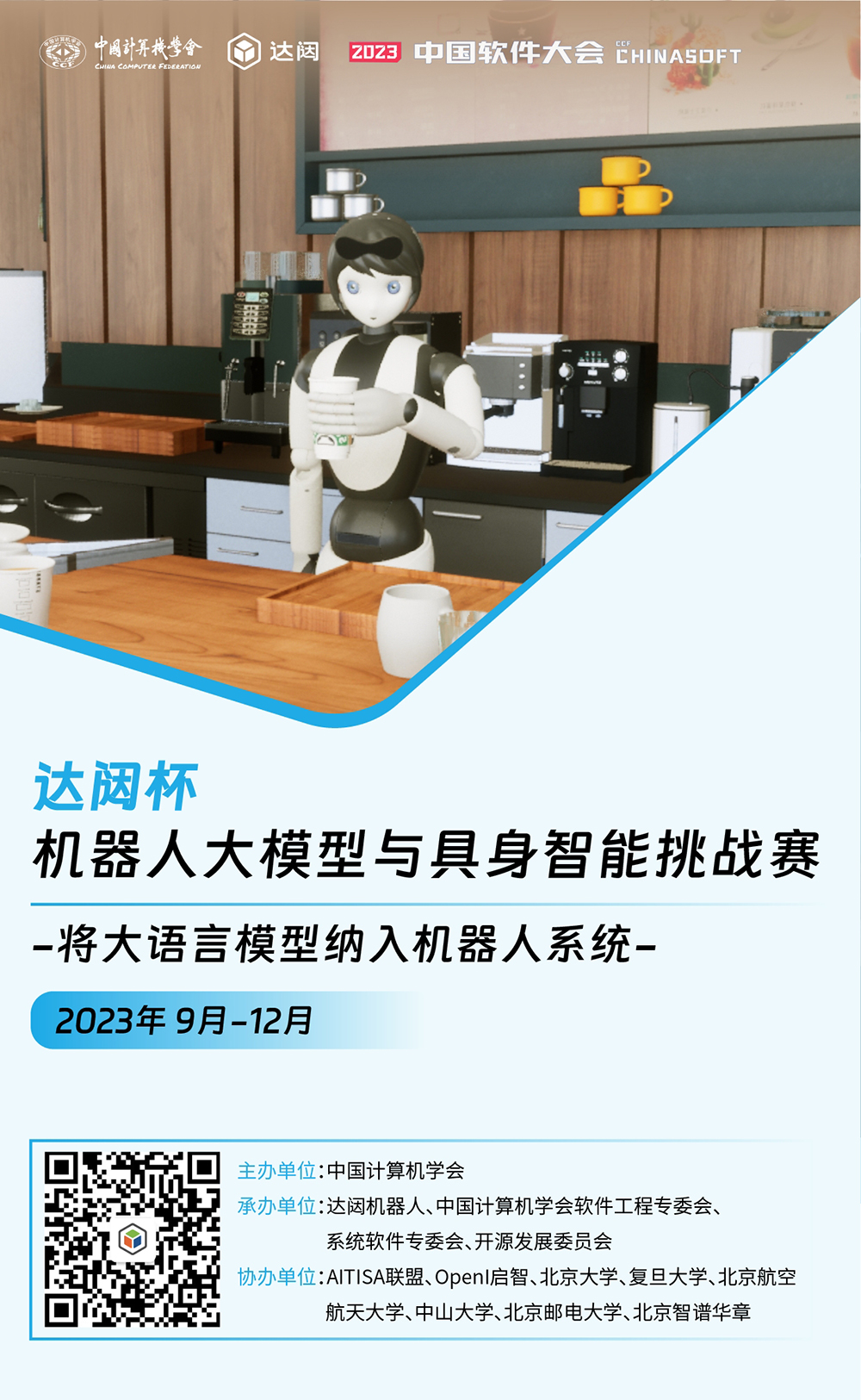 達闥雲端機器人國家新一代人工智能開放創新平台與中國計算機學會、AITISA聯盟、OpenI啟智、CCF開源發展委員會、北京大學、復旦大學、北京航空航天大學、中山大學、北京郵電大學、北京智譜聯合,共同舉辦達闥杯「機器人大模型與具身智能挑戰賽」,旨在鼓勵開發者能夠利用大模型技術和具身智能技術,實現跨模態人機交互、並能自主完成各種複雜任務的機器人應用。